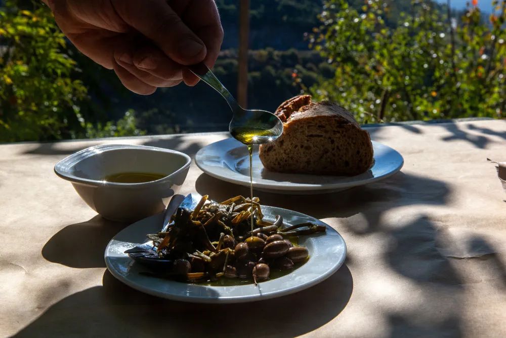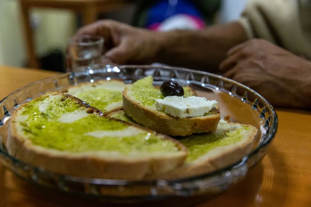 ↑在希臘伯羅奔尼撒半島麥西尼亞拍攝的涂有橄欖油的面包。