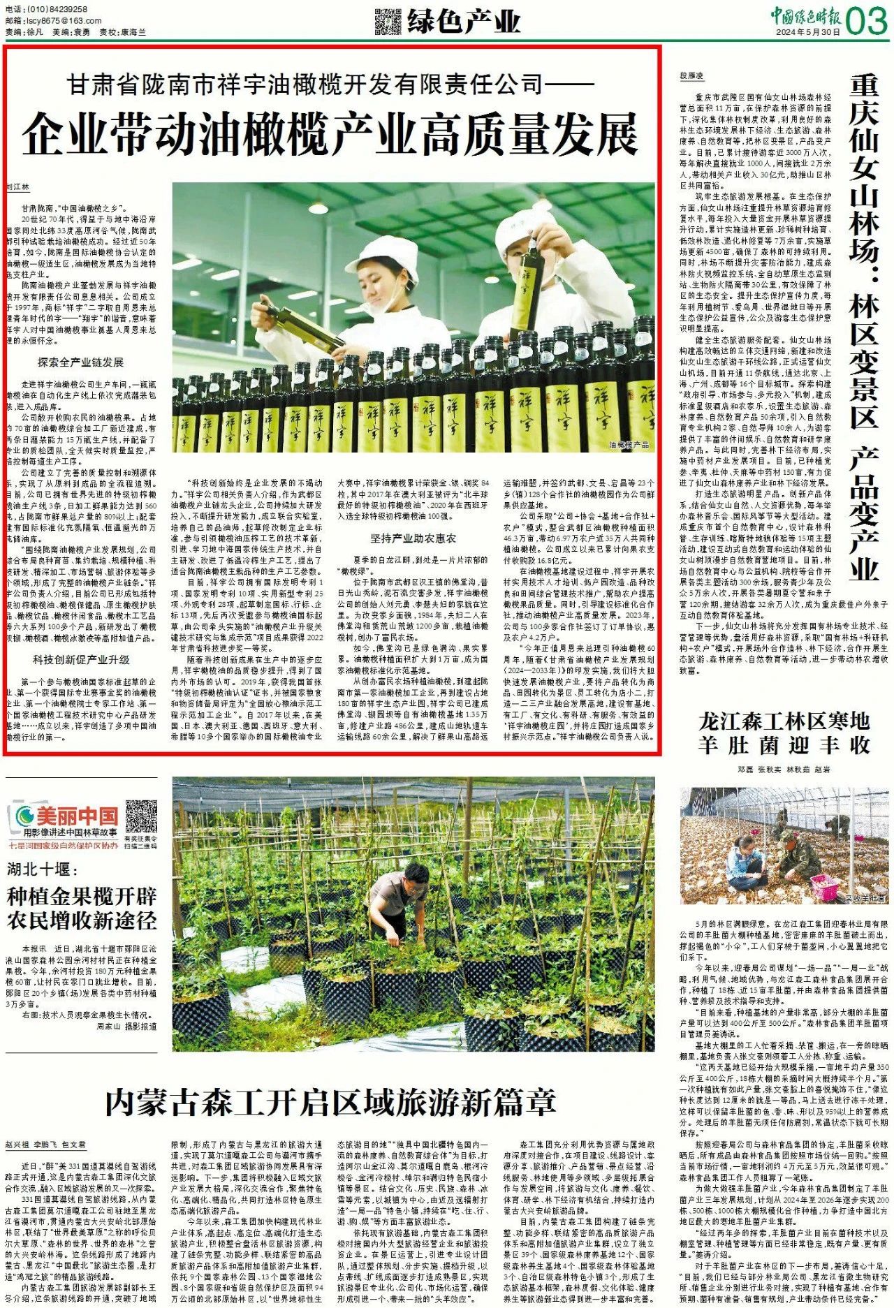 甘肅隴南,“中國油橄欖之鄉(xiāng)”。20世紀(jì)70年代,得益于與地中海沿岸國家同處北緯33度高原河谷氣候,隴南武都引種試驗栽培油橄欖成功。經(jīng)過近50年培育,如今,隴南是國際油橄欖協(xié)會認(rèn)定的油橄欖一級適生區(qū),油橄欖發(fā)展成為當(dāng)?shù)靥厣еa(chǎn)業(yè)。隴南油橄欖產(chǎn)業(yè)蓬勃發(fā)展與祥宇油橄欖開發(fā)有限責(zé)任公司息息相關(guān)。公司成立于1997年,商標(biāo)“祥宇”二字取自周恩來總理青年時代的字——“翔宇”的諧音,意味著祥宇人對中國油橄欖事業(yè)奠基人周恩來總理的永恒懷念。探索全產(chǎn)業(yè)鏈發(fā)展走進(jìn)祥宇油橄欖公司生產(chǎn)車間,一瓶瓶橄欖油在自動化生產(chǎn)線上依次完成灌裝包裝,進(jìn)入成品庫。公司敞開收購農(nóng)民的油橄欖果。占地約70畝的油橄欖綜合加工廠新近建成,有兩條日灌裝能力15萬瓶生產(chǎn)線,并配備了專業(yè)的質(zhì)檢團隊,全天候?qū)崟r質(zhì)量監(jiān)控,嚴(yán)格控制每道生產(chǎn)工序。公司建立了完善的質(zhì)量控制和溯源體系,實現(xiàn)了從原料到成品的全流程追溯。目前,公司已擁有世界先進(jìn)的特級初榨橄欖油生產(chǎn)線3條,日加工鮮果能力達(dá)到560噸,占隴南市鮮果總產(chǎn)量的80%以上;配套建有國際標(biāo)準(zhǔn)化充氮隔氧、恒溫避光的萬噸儲油庫?!皣@隴南油橄欖產(chǎn)業(yè)發(fā)展規(guī)劃,公司綜合布局良種育苗、集約栽培、規(guī)模種植、科技研發(fā)、精深加工、市場營銷、旅游體驗等多個領(lǐng)域,形成了完整的油橄欖產(chǎn)業(yè)鏈條。”祥宇公司負(fù)責(zé)人介紹,目前公司已形成包括特級初榨橄欖油、橄欖保健品、原生橄欖護(hù)膚品、橄欖飲品、橄欖休閑食品、橄欖木工藝品等六大系列100多個產(chǎn)品,新研發(fā)出了橄欖雙椒、橄欖酒、橄欖冰激凌等高附加值產(chǎn)品??萍紕?chuàng)新促產(chǎn)業(yè)升級第一個參與橄欖油國家標(biāo)準(zhǔn)起草的企業(yè)、第一個獲得國際專業(yè)賽事金獎的油橄欖企業(yè)、第一個油橄欖院士專家工作站、第一個國家油橄欖工程技術(shù)研究中心產(chǎn)品研發(fā)基地……成立以來,祥宇創(chuàng)造了多項中國油橄欖行業(yè)的第一?!翱萍紕?chuàng)新始終是企業(yè)發(fā)展的不竭動力?!毕橛罟鞠嚓P(guān)負(fù)責(zé)人介紹,作為武都區(qū)油橄欖產(chǎn)業(yè)鏈龍頭企業(yè),公司持續(xù)加大研發(fā)投入,不斷提升研發(fā)能力,成立聯(lián)合實驗室,培養(yǎng)自己的品油師,起草修改制定企業(yè)標(biāo)準(zhǔn),參與引領(lǐng)橄欖油壓榨工藝的技術(shù)革新,引進(jìn)、學(xué)習(xí)地中海國家傳統(tǒng)生產(chǎn)技術(shù),并自主研發(fā)、改進(jìn)了低溫冷榨生產(chǎn)工藝,提出了適合隴南油橄欖主栽品種的生產(chǎn)工藝參數(shù)。目前,祥宇公司擁有國際發(fā)明專利1項、國家發(fā)明專利10項、實用新型專利25項、外觀專利28項,起草制定國標(biāo)、行標(biāo)、企標(biāo)13項,先后兩次受邀參與橄欖油國標(biāo)起草,由公司牽頭實施的“油橄欖產(chǎn)業(yè)升級關(guān)鍵技術(shù)研究與集成示范”項目成果獲得2022年甘肅省科技進(jìn)步獎一等獎。隨著科技創(chuàng)新成果在生產(chǎn)中的逐步應(yīng)用,祥宇橄欖油的品質(zhì)穩(wěn)步提升,得到了國內(nèi)外市場的認(rèn)可。2019年,獲得我國首張“特級初榨橄欖油認(rèn)證”證書,并被國家糧食和物資儲備局評定為“全國放心糧油示范工程示范加工企業(yè)”。自2017年以來,在美國、日本、澳大利亞、德國、西班牙、意大利、希臘等10多個國家舉辦的國際橄欖油專業(yè)大賽中,祥宇油橄欖累計榮獲金、銀、銅獎84枚,其中2017年在澳大利亞被評為“北半球最好的特級初榨橄欖油”、2020年在西班牙入選全球特級初榨橄欖油100強。堅持產(chǎn)業(yè)助農(nóng)惠農(nóng)夏季的白龍江畔,到處是一片片濃郁的“橄欖綠”。位于隴南市武都區(qū)漢王鎮(zhèn)的佛堂溝,昔日光山禿嶺,泥石流災(zāi)害多發(fā),祥宇油橄欖公司的創(chuàng)始人劉元勇、李慧夫婦的家就在這里。為改變家鄉(xiāng)面貌,1984年,夫婦二人在佛堂溝租賃荒山荒坡1200多畝,栽植油橄欖樹,創(chuàng)辦了富民農(nóng)場。如今,佛堂溝已是綠色滿溝、果實累累。油橄欖種植面積擴大到1萬畝,成為國家油橄欖標(biāo)準(zhǔn)化示范基地。從創(chuàng)辦富民農(nóng)場種植油橄欖,到建起隴南市第一家油橄欖加工企業(yè),再到建設(shè)占地180畝的祥宇生態(tài)產(chǎn)業(yè)園,祥宇公司已建成佛堂溝、椒園壩等自有油橄欖基地1.35萬畝,修建產(chǎn)業(yè)路486公里,建成山地軌道車運輸線路60余公里,解決了鮮果山高路遠(yuǎn)運輸難題,并簽約武都、文縣、宕昌等23個鄉(xiāng)(鎮(zhèn))128個合作社的油橄欖園作為公司鮮果供應(yīng)基地。公司采取“公司+協(xié)會+基地+合作社+農(nóng)戶”模式,整合武都區(qū)油橄欖種植面積46.3萬畝,帶動6.97萬農(nóng)戶近35萬人共同種植油橄欖。公司成立以來已累計向果農(nóng)支付收購款16.8億元。在油橄欖基地建設(shè)過程中,祥宇開展農(nóng)村實用技術(shù)人才培訓(xùn)、低產(chǎn)園改造、品種改良和田間綜合管理技術(shù)推廣,幫助農(nóng)戶提高橄欖果品質(zhì)量。同時,引導(dǎo)建