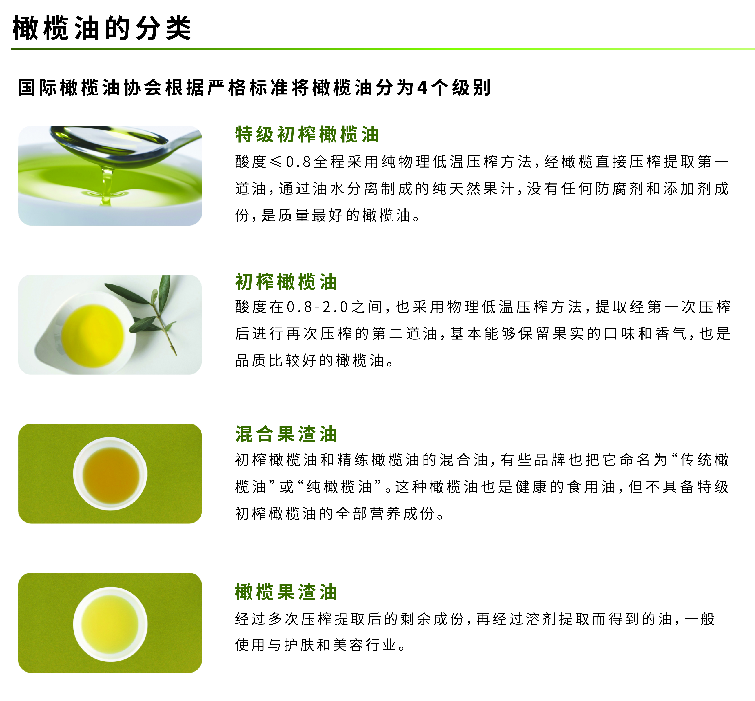國際橄欖油協(xié)會(huì)根據(jù)嚴(yán)格標(biāo)準(zhǔn)將橄欖油分為4個(gè)級(jí)別: