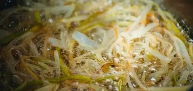 待竹筷周圍起泡后,依次放入切好的蔥、姜、蒜。